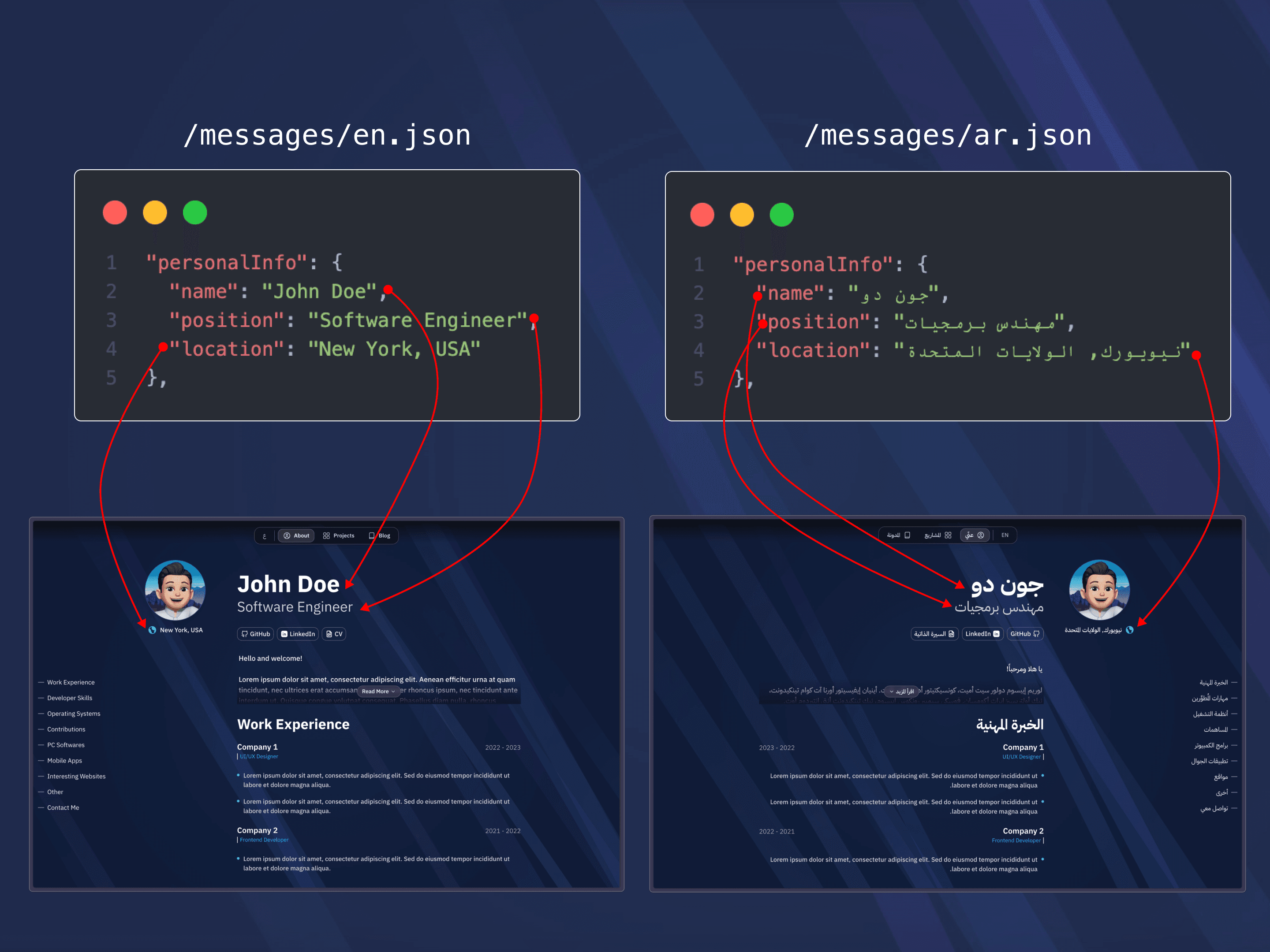 هذا المشروع يأتي بدعم كامل للغتين العربية والإنقليزية بإستخدام. يتم تخزين نصوص الموقع في ملفات JSON مرتبة ومنظمة. مما يُسهِّل تعديله أو إضافة لغاتٍ أخرى عند الحاجة.ببساطة قم بتعديل النصوص في ملفي الـ JSON وفي ملفّي ar.json و en.json بأي نص تريده, وستنعكس التغييرات تلقائيًا في الموقع!!